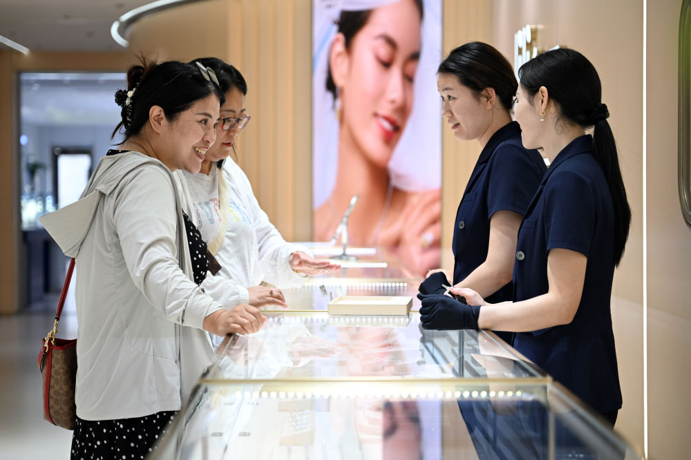 顾客在力量钻石直营首饰工厂店选购钻石首饰(6月11日摄)。新华社记者 李嘉南 摄